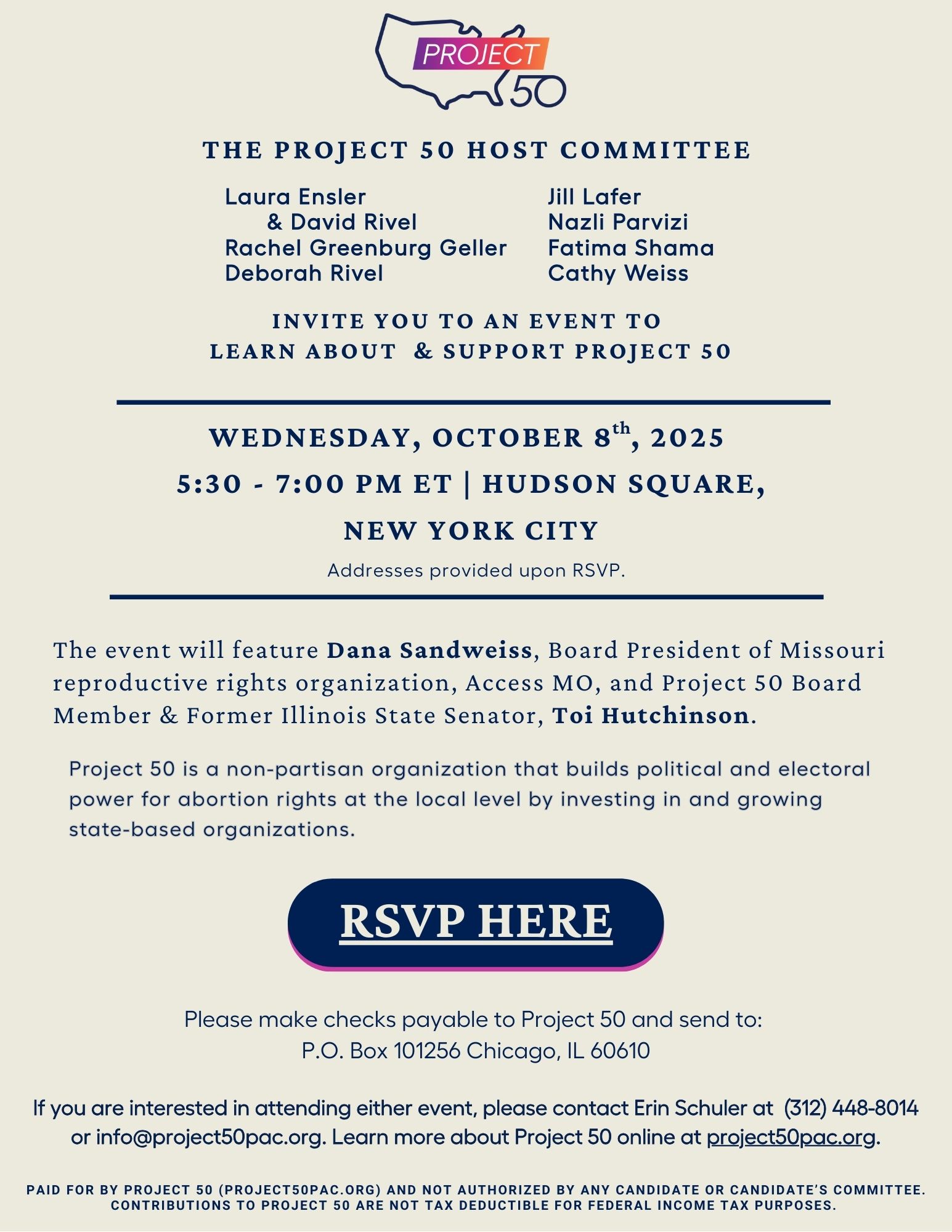 The event will feature Dana Sandweiss, Board President of Missouri’s groundbreaking reproductive rights organization, Access MO, and Project 50 Board Member & Former Illinois State Senator, Toi Hutchinson.